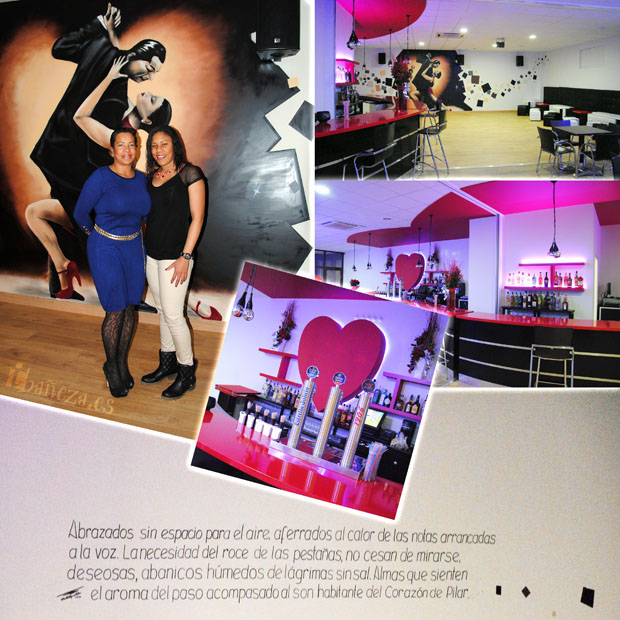 Rojo, negro y blanco son los tres colores –los tonos preferidos de Pilar– que decoran un local donde la barra es un corazón gigante que divide en dos el espacio, precisamente para separar (que no dividir) los dos ambientes y los dos tipos de público que mientras bailan o toman una copa pueden disfrutar de un original grafiti de Toño Prada (‘Artes’ para los aficionados al arte urbano) que retrata una pareja en pleno tango; una de las imágenes más genuinas de Argentina ocupa la práctica totalidad de la pared del salón de baile en el que una frase de Baena también recuerda que ese es un lugar para las “almas que sienten el aroma del paso acompasado al son habitante del Corazón de Pilar”.