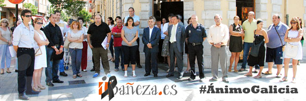 Justo antes de dar comienzo al pleno ordinario correspondiente al mes de julio, la Corporación Municipal de La Bañeza, funcionarios del Ayuntamiento, empresarios, profesionales de medios de comunicación locales y varios bañezanos anónimos se han concentrado al mediodía de este jueves en la Plaza Mayor de la ciudad para guardar un minuto de silencio en memoria de las víctimas del accidente de tren ocurrido ayer cerca de Santiago de Compostela y en el que han fallecido decenas de personas.